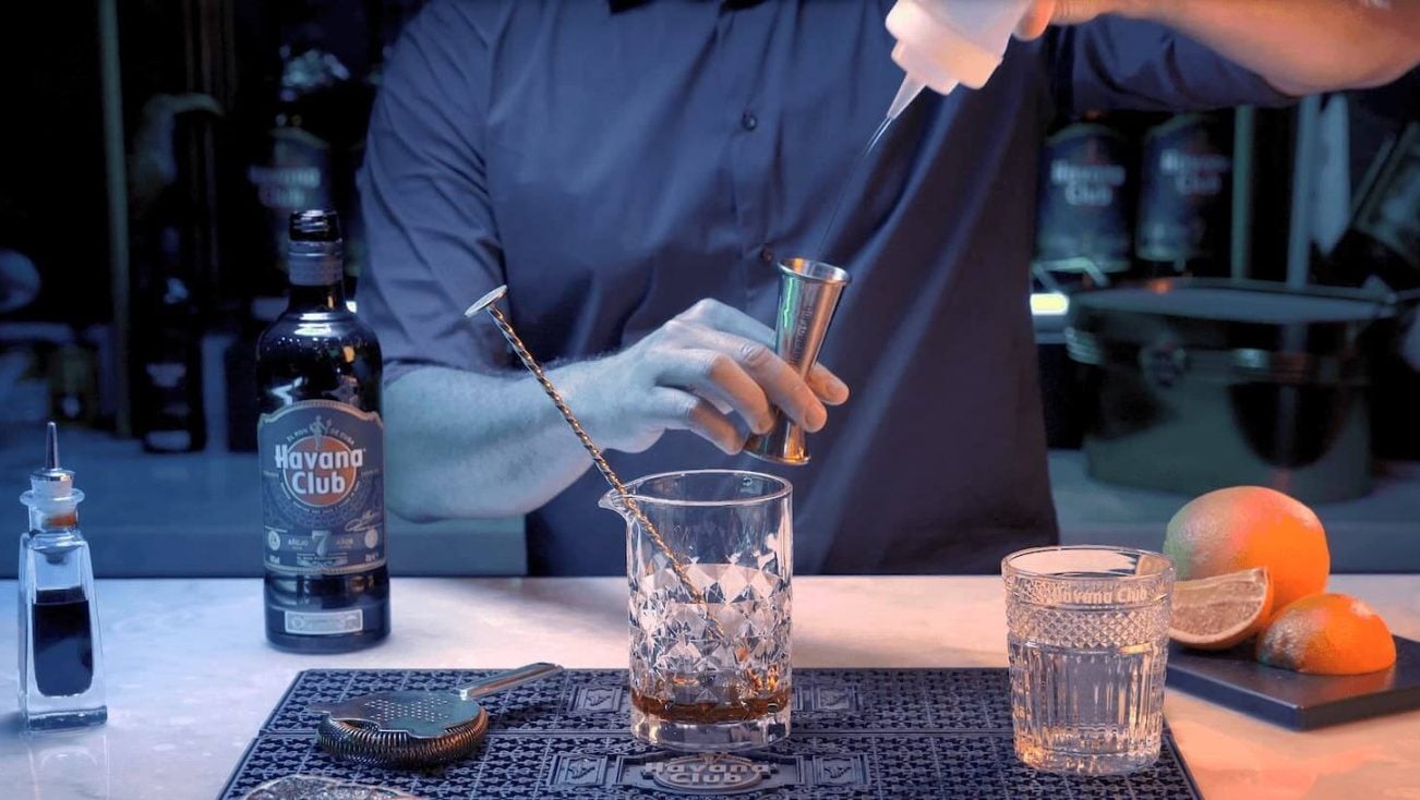 Σε ένα ποτήρι του ουίσκι, αναμείξτε τη ζάχαρη και τα bitters, έπειτα προσθέστε το κουβανέζικο ρούμι Havana Club 7. Ανακατέψτε ξανά.